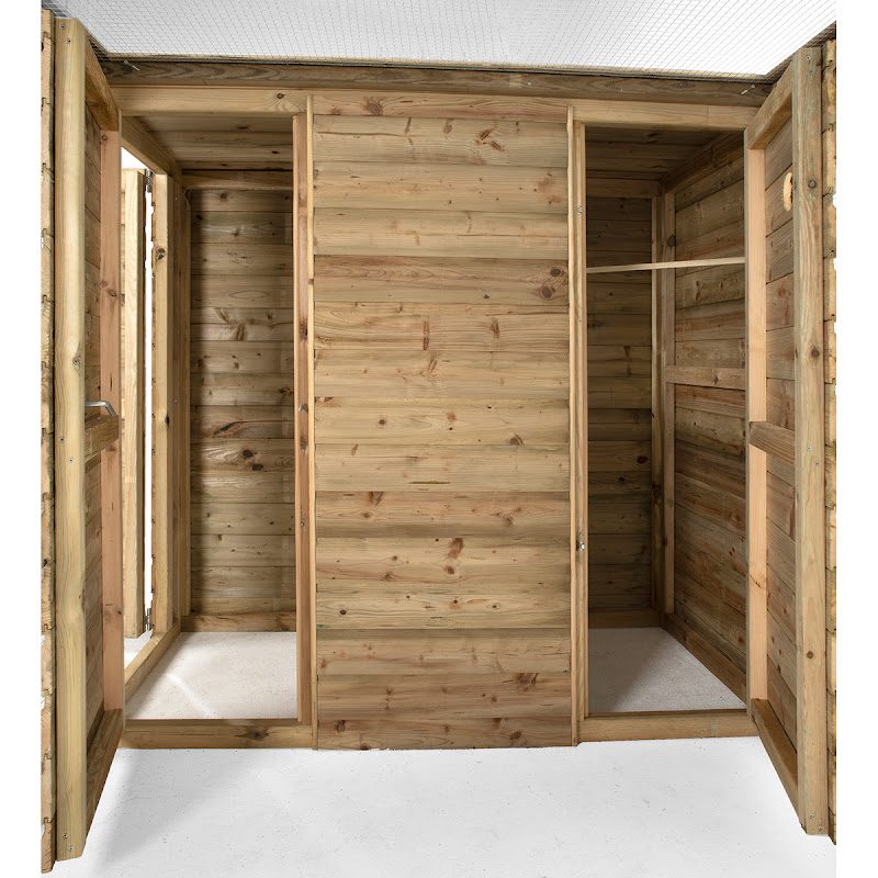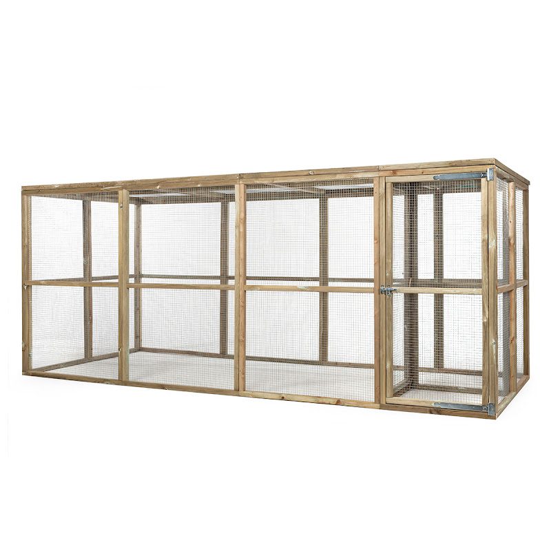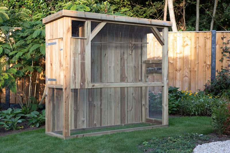 Deze voliere is geconstrueerd met geïmpregneerd naaldhout, en is hierdoor onderhoudsarm.
