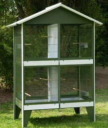 Volière met ruime slaapruimte beschikt over dubbele toegangsdeur tegen ontsnappen.