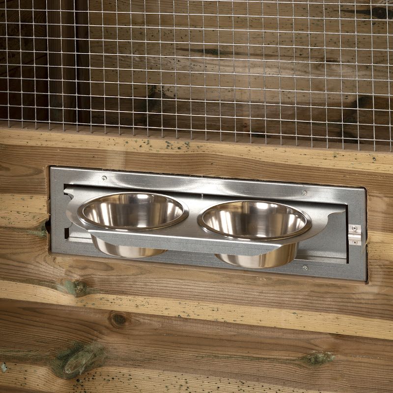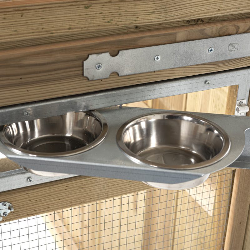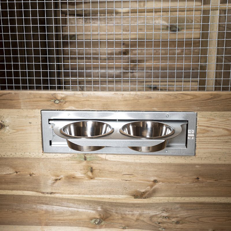 De voliere is beschikt over een draaibaar 2 baks voedersysteem.