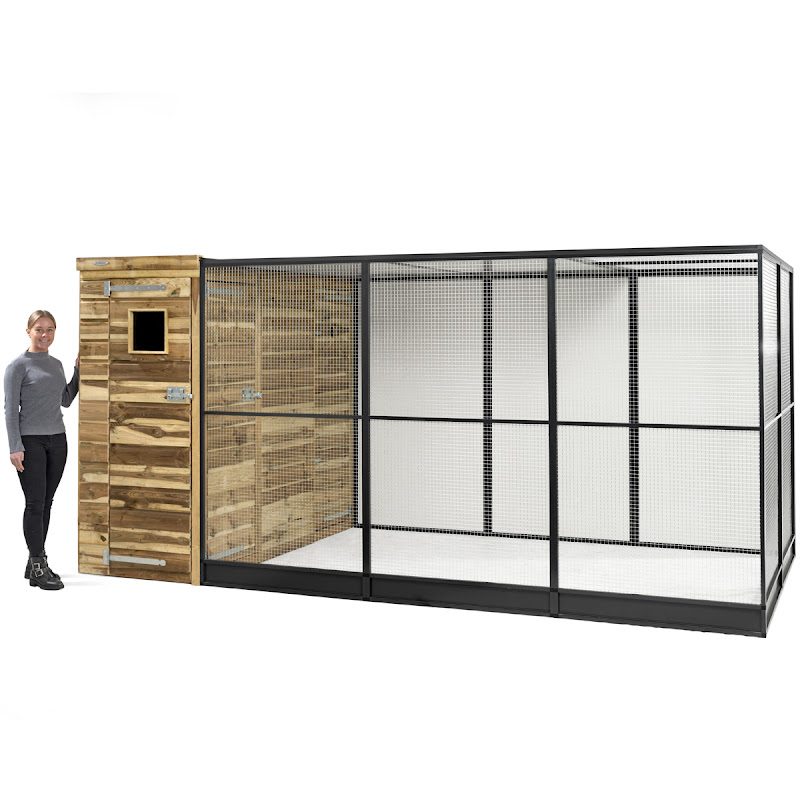 Hoogwaardige aluminium volière van 289 x 220 x 190 cm met nachthok van behandeld hout.